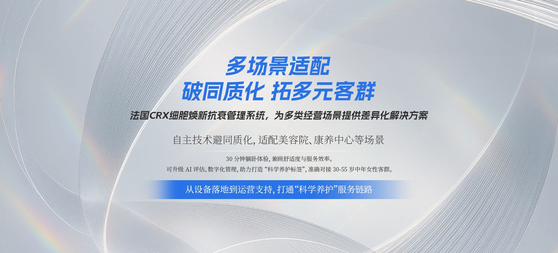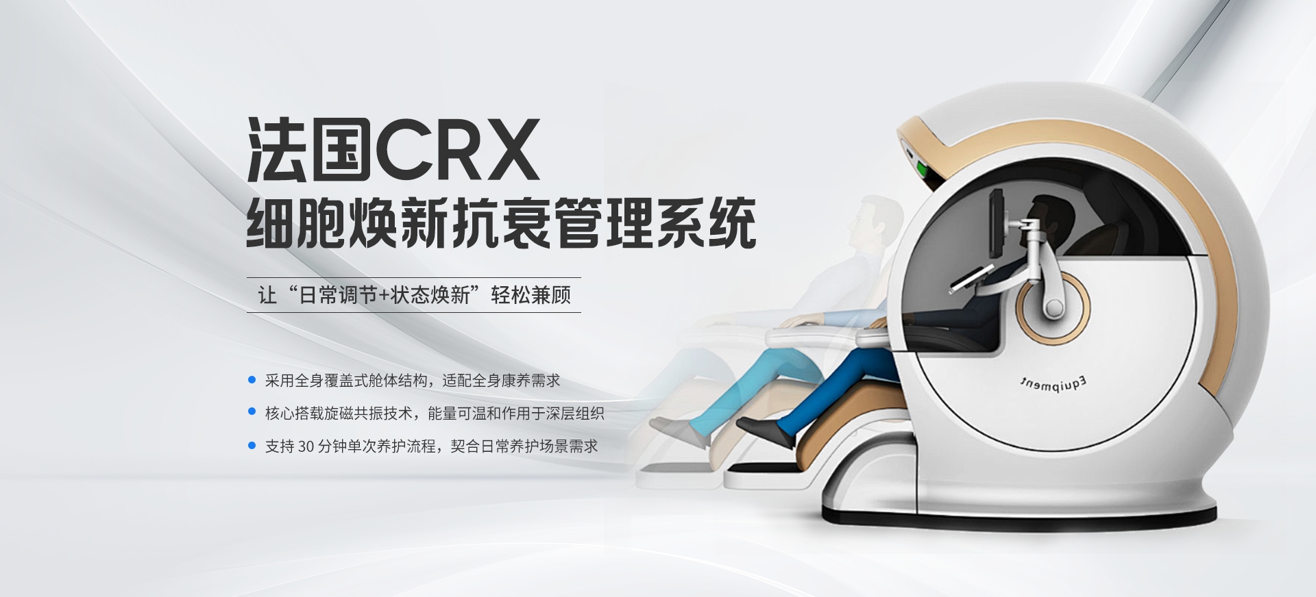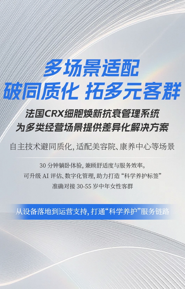 采用类高压氧舱、美黑机的大型舱体设计,客户躺下即可享受全身养护, 无需频繁调整姿势,单次体验仅30分钟,适配快节奏生活需求。 设备操作界面简洁易懂,操作人员经短期培训后即可熟练操控,契合高频服务场景