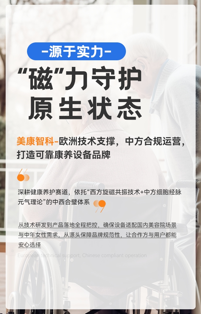 美康智科聚焦大健康领域,以旋磁共振技术为核心,深耕中年女性健康需求与美容院运营痛点:总部位于香港,依托国际资源引入先进技术;在国内设立运营中心,负责产品生产、落地服务与招商合作,确保设备与服务贴合国内市场;成熟研发团队持续推进产品升级——从局部调节到全身舱体,从单一设备到数字化平台,不断迭代产品形态,只为为合作方与用户提供品质的健康养护解决方案